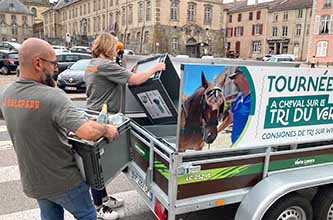 L’équipage, venant de la Galopade, centre équestre à Lunéville, est composé d’un cocher et de 2 personnes, pour collecter le verre. L’attelage est tiré par un cheval qui effectue chaque samedi une tournée auprès des professionnels du centre ancien de Lunéville pour collecter du verre (bouteilles, flacons, bocaux). Le fruit de la collecte, près de 5 à 600 kg de verre, est ensuite placé dans les bornes à verre.