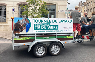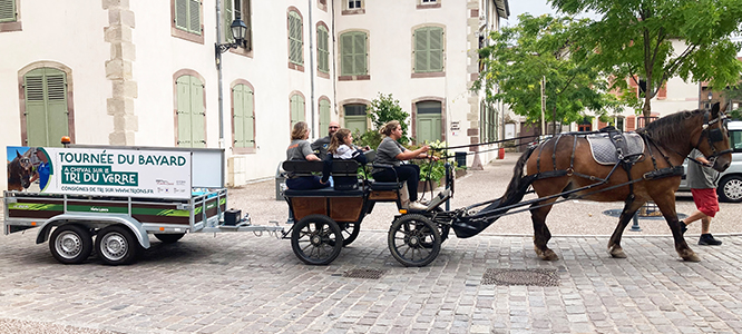 Tous les samedis, de 16h à 18h, un attelage tiré par un cheval du nom de Bayard, sensibilise au tri sélectif du verre en proposant aux commerçants du centre de Lunéville de collecter leur verre usagé. A l’initiative de la Communauté de Communes, cette animation estivale replace le cheval au cœur de la cité cavalière, collecte près de 600 kg de verre par tournée et fait sourire promeneurs et clients des terrasses.