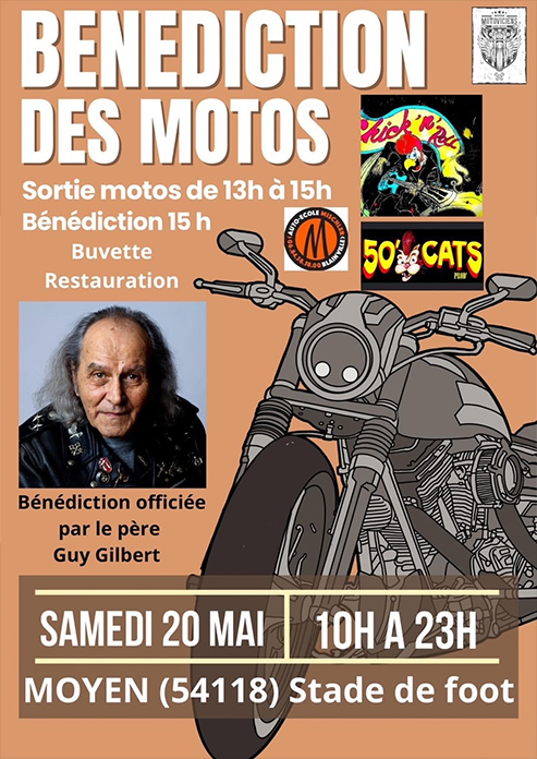 L’association « Les Motoviciens » de Moyen organise une journée de rassemblement pour les motards, samedi 20 mai de 10h à 23h au stade de foot de Moyen. L’occasion de participer à la bénédiction des motos officiée par le père Guy Gilbert.
