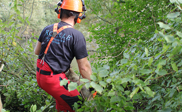 Entretien de la ripisylve : suppression de 10 % des arbres petits et moyens, en priorisant ceux qui penchent vers le cours d'eau.