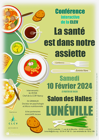Ce samedi 10 février 2024, la CLCV (association de défense des consommateurs et usagers) organise au salon des Halles de Lunéville une journée interactive sur le thème « La santé est dans notre assiette ».