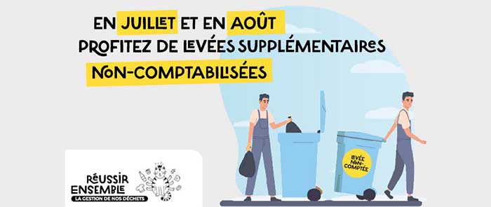 Entre le 1er et le 31 juillet 2023 : toute levée du bac de collecte comptée, donne droit à une seconde levée supplémentaire non-comptée. De même, entre le 1er et le 31 août 2023 : toute levée du bac de collecte comptée donne droit à une nouvelle levée supplémentaire non-comptée.