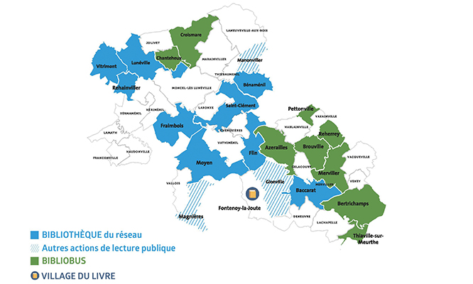 Doté à présent de 9 établissements, le Réseau des bibliothèques et médiathèques en Lunévillois est présent sur les communes de Lunéville, Baccarat, Bénaménil, Flin, Fraimbois, Moyen, Rehainviller, Saint-Clément et Vitrimont et propose :