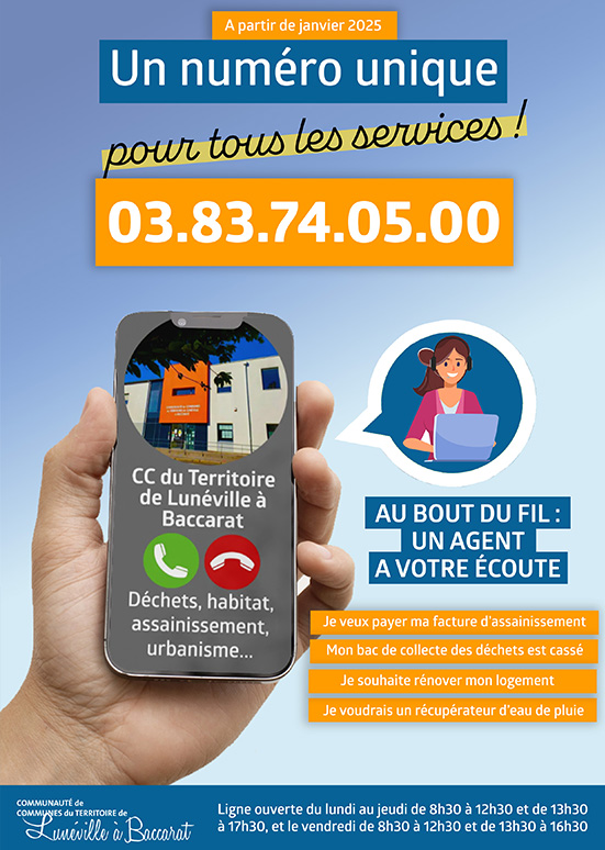 Désormais, tous les services de la Communauté de communes sont joignables au 03 83 74 05 00, plateforme unique. Le numéro vert du service déchets est supprimé.