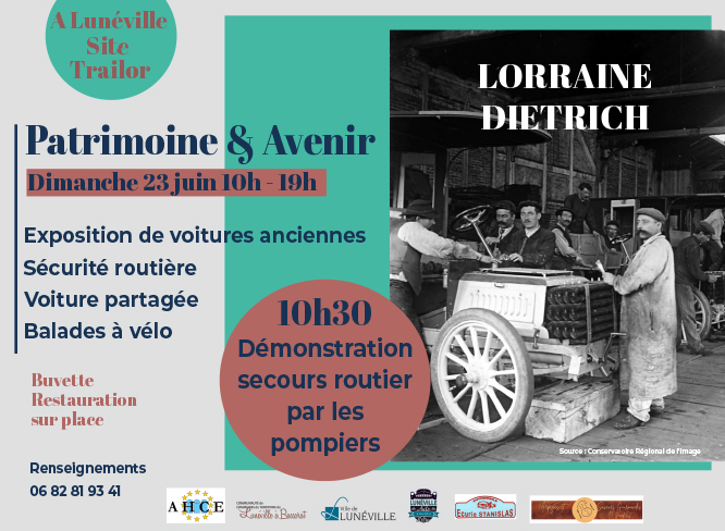 Dimanche 23 juin, de 10h à 19h, le site de l’ancienne usine Trailor accueillera la manifestation « Patrimoine et Avenir » organisée par l’association des Amis de l’Histoire Culturelle Européenne en partenariat avec la Communauté de communes du territoire de Lunéville à Baccarat. Venez découvrir le passé industriel automobile et les nouveaux modes de déplacement d’aujourd’hui.