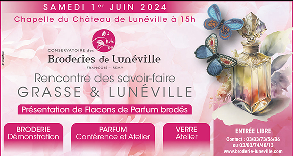 A la suite du lancement de l’eau de parfum « Rêve de brodeuse », le Conservatoire des Broderies en partenariat avec la ville de Lunéville et la Communauté de communes du Territoire de Lunéville à Baccarat, accueille ce samedi 1er juin, la délégation de la ville de Grasse et la Maison Galimard. Une belle rencontre en perspective.